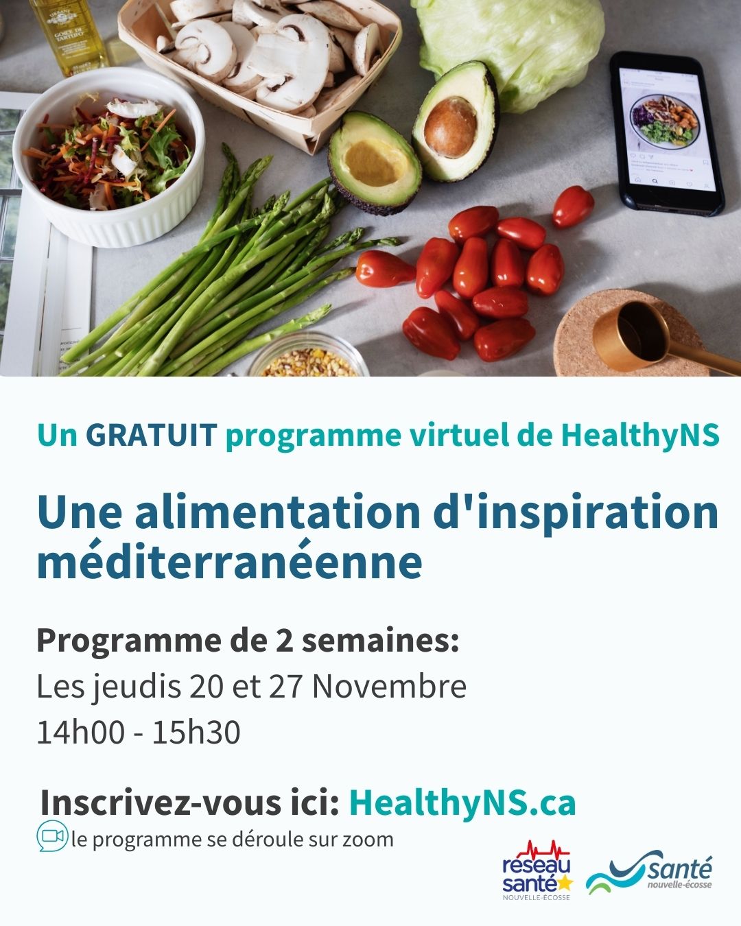 Découvrez comment de simples habitudes quotidiennes inspirées du style méditerranéen d’alimentation peuvent favoriser votre santé et votre bien-être. Ce programmemet l’accent sur des changements faciles et agréables que vous pouvez apporter à vos repas. La participation à la première semaine de la série est obligatoire.