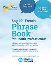 This phrase book was developed to help health care professionals in Nova Scotia provide their services in French. It features useful phrases and terms for health care settings in English, French and Acadian French and covers various functions and areas of health care, including assessments, tests and procedures, medications, paramedic care, providing care to children, mental health, social services, etc. The phrase book can be ordered free of charge by health care professionals in Nova Scotia.